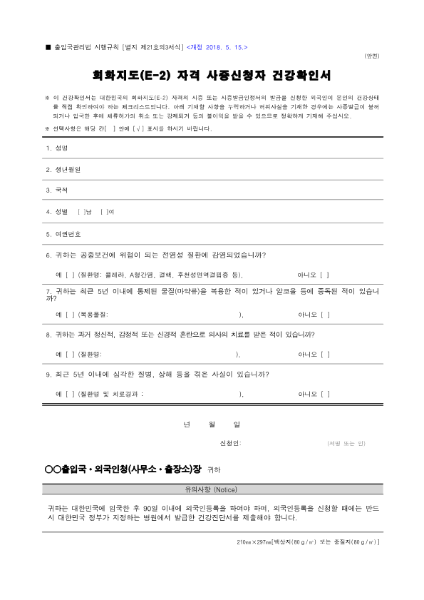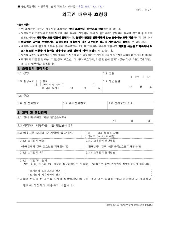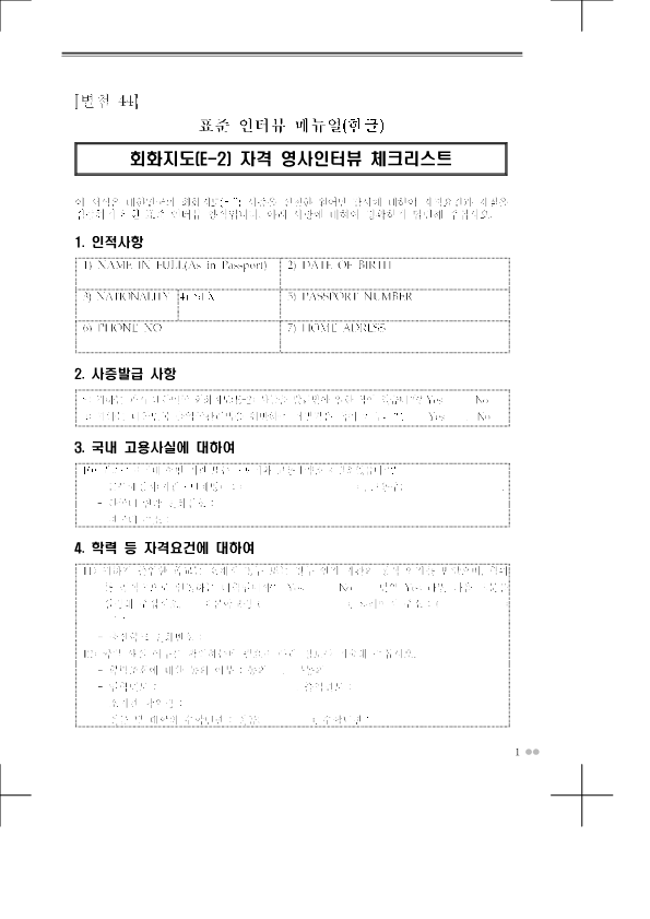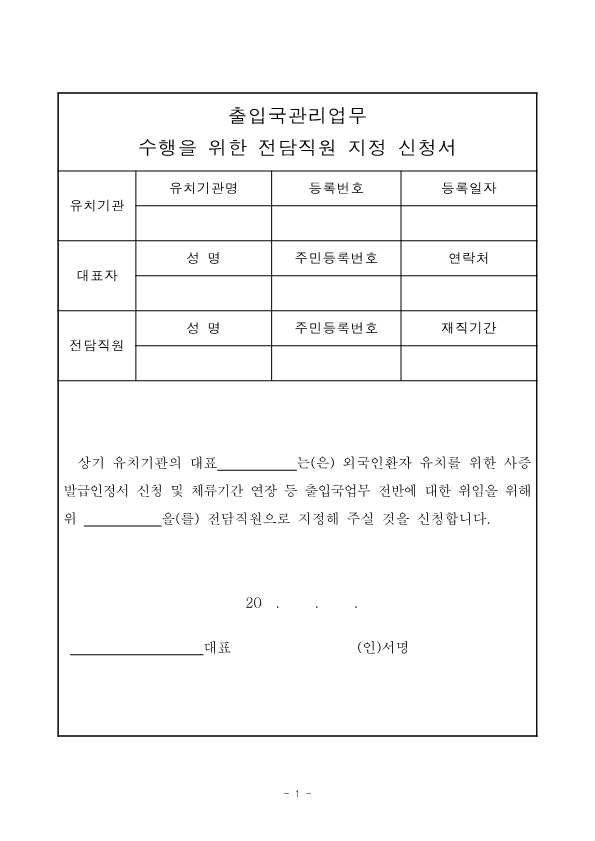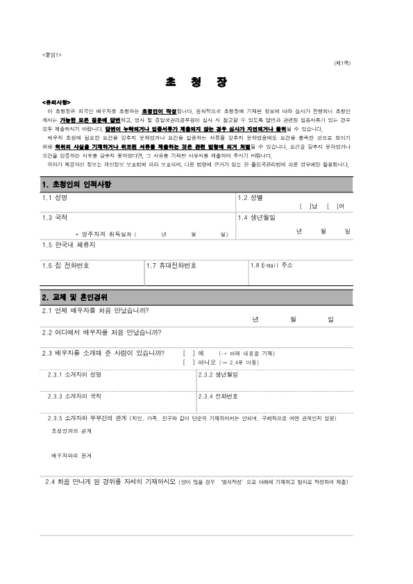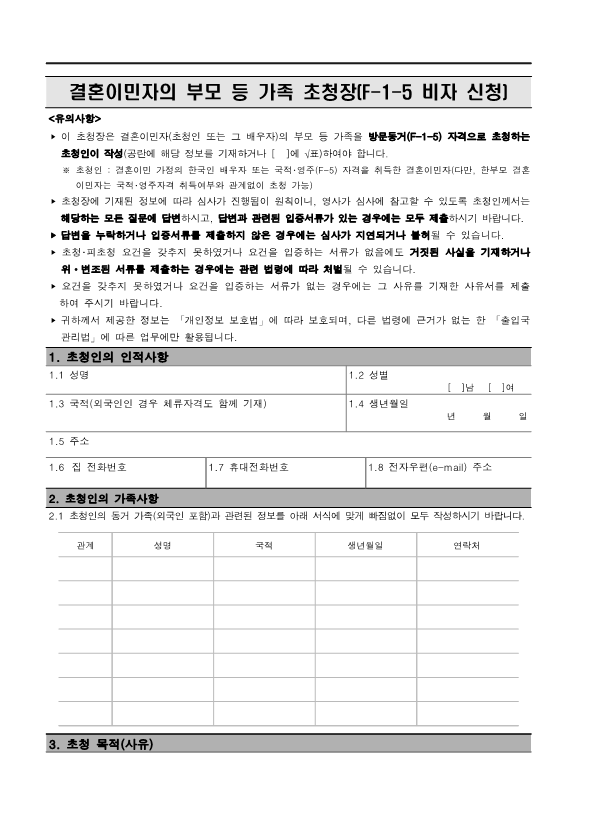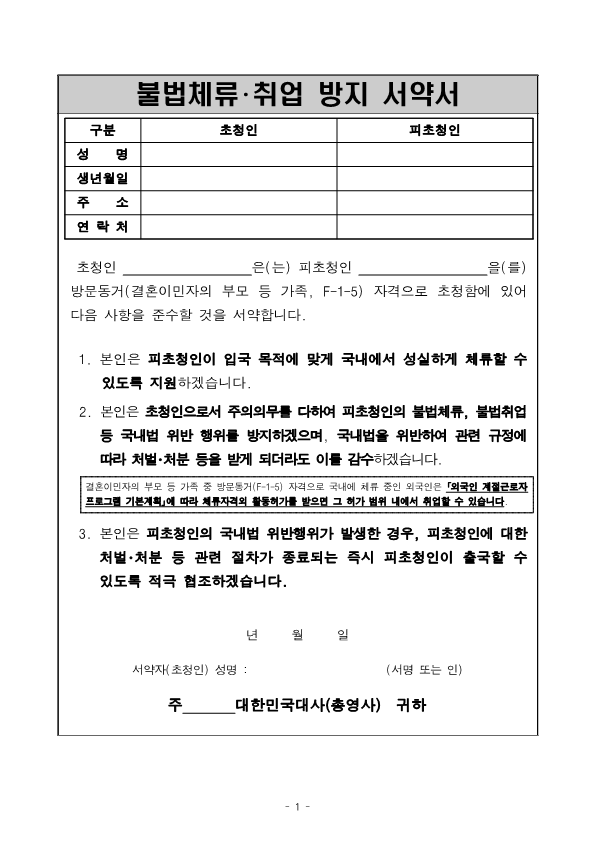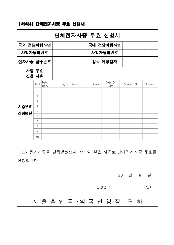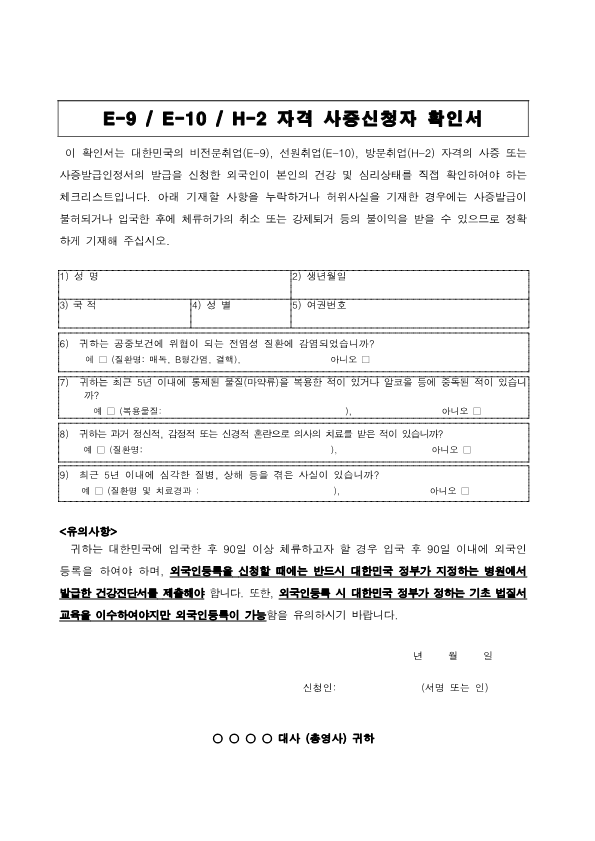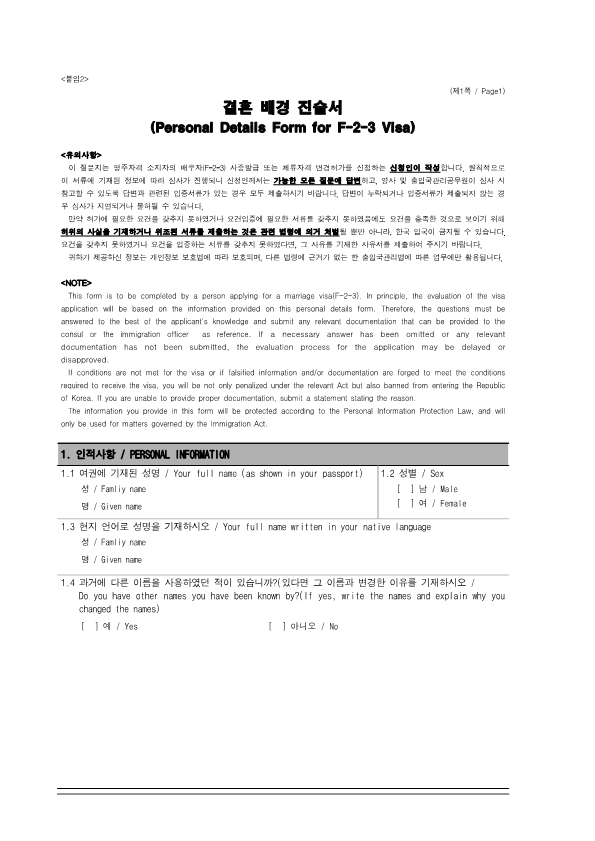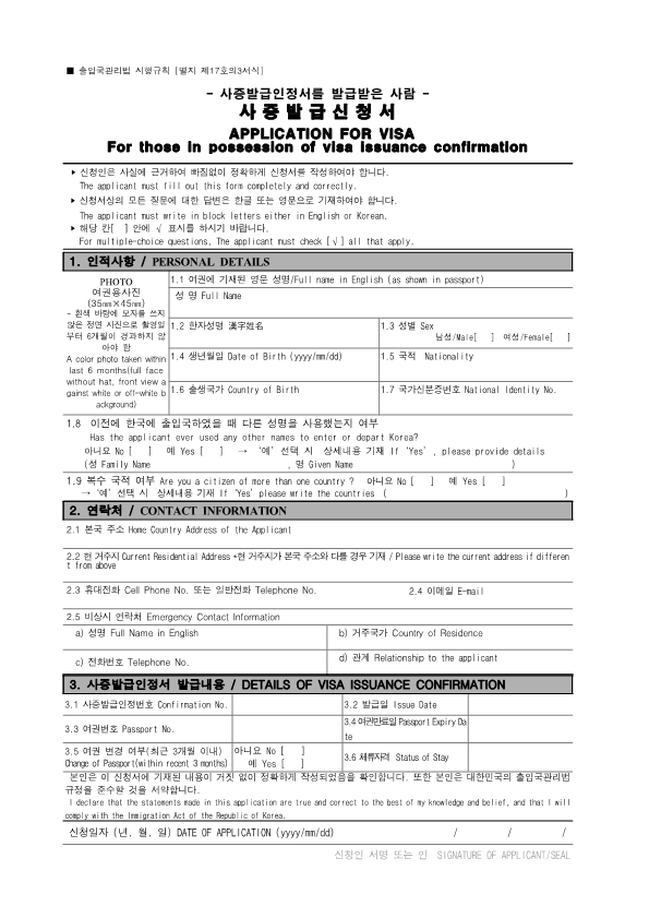 Visa Issuance Download immigration forms related to staying in Korea. Statement of Family Income of the Inviter of a Foreign Spouse View Form Visa Application Form (For Applicants with a Certificate of Visa Issuance) View Form VISA APPLICATION FORM View Form Personal Details Form for a Marriage Migrant Visa View Form Personal Details Form for F-2-3 Visa View Form Pledge to Prevent Illegal Stay and Unauthorized Employment View Form Invitation Letter for a Foreign Spouse View Form List of Applicants Eligible for Group Visa Issuance View Form List to be Issued Visas View Form Invitation Letter for Foreign Spouse Visa View Form Invitation Letter for Family Members of a Marriage Immigrant (F-1-5 Visa Application) View Form Health Statement for E-2 (Conversation Instructor) Visa Applicants View Form Confirmation of Invitation for a Foreign Patient View Form Confirmation of Visa Applicant (E-9 E-10 H-2 Status) View Form Consular Interview Checklist for E-2 (Conversation Instructor) Visa Applicants View Form Application for Invalidation of Group Electronic Visa View Form 團體査證發給申請書 Application For Group Visa Issuance View Form Application for certificate of visa eligibility View Form A Letter of Employment Recommendation for Special Foreign Worke View Form